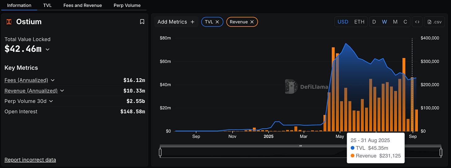Ostium generates revenue through trading fees, but unlike most DEXs that charge both opening and closing fees, Ostium charges only on entry. Liquidations and volatility spikes also contribute significantly to protocol revenue. Over time, the goal is to push costs closer to zero (mirroring Robinhood’s innovation) while maintaining sustainable revenue through institutional partnerships.