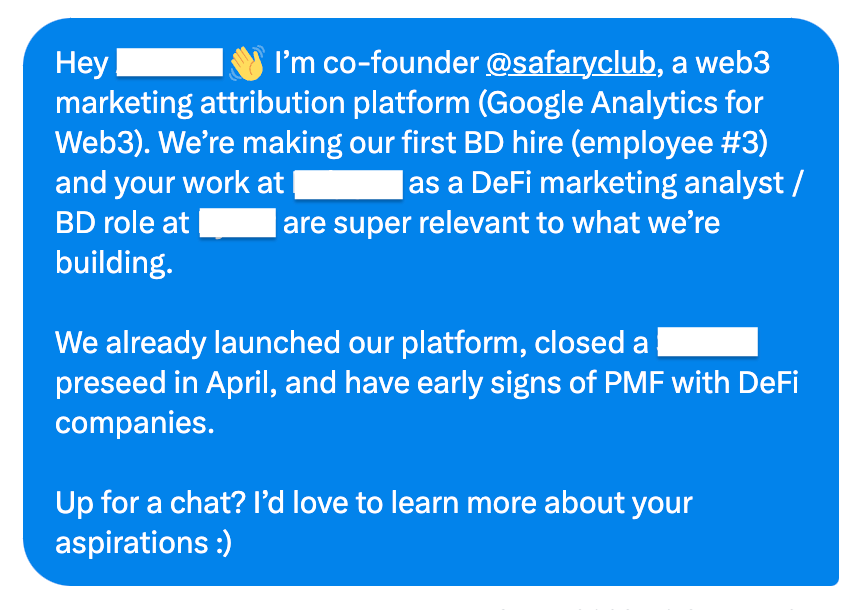Then we reached out to candidates on Twitter. Thatās where Justin has the most web3 social proof (10K+ followers) and could tag our company for further social proof.