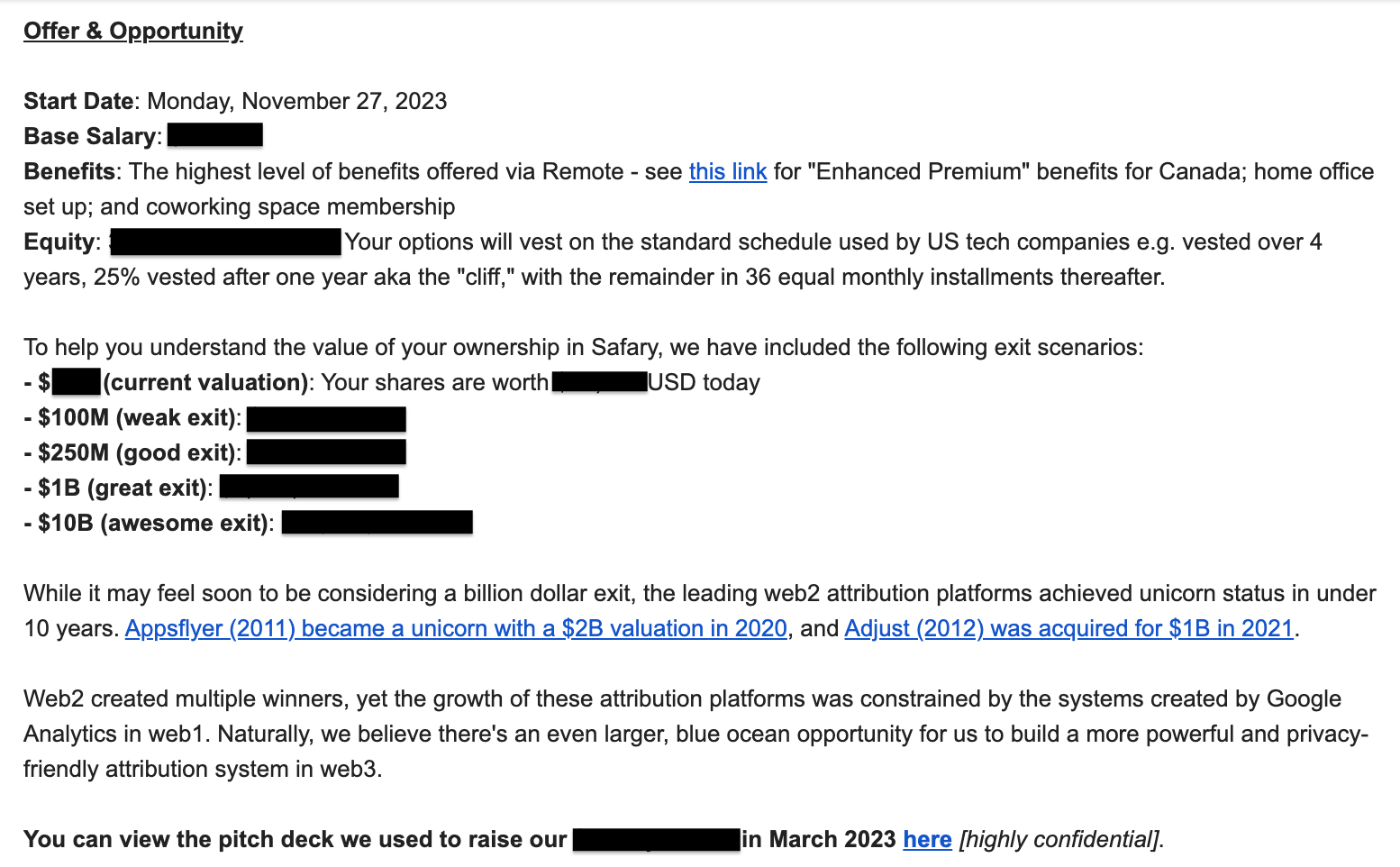 Then we follow up with an email to close the deal. We give our current valuation, exit scenarios, reasons why weāll win, and our recent fundraising pitch deck.