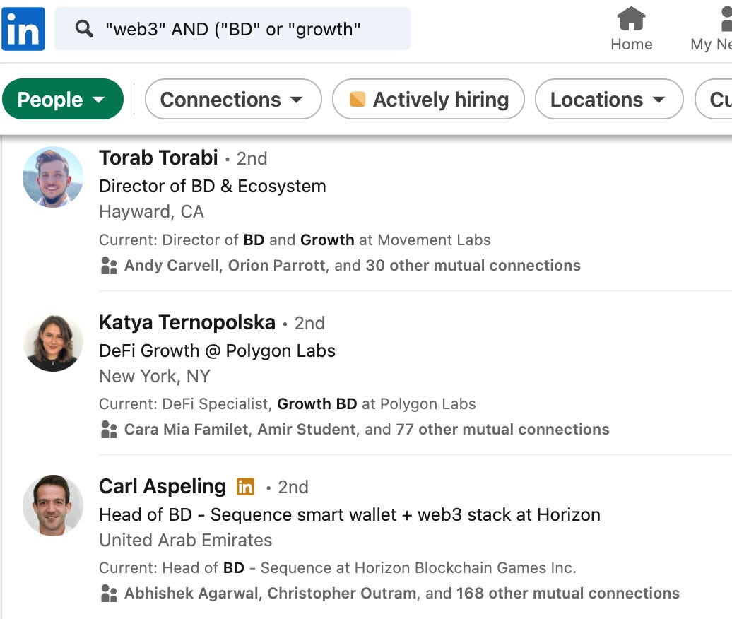 We searched for candidates with BD experience and/or industry knowledge, so we filtered for web3 analysts, researchers, business managers, and ecosystem leads. We leveraged various queries (like this one) on LinkedIn, which output these profiles: